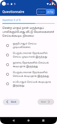 *) Language Customization: The app currently supports English and Tamil versions of the questionnaire, catering to users who prefer either language. Additionally, the developers are committed to inclusivity and accessibility by offering to integrate questionnaire versions in other languages upon user request, ensuring that the app remains accessible to a diverse user base.