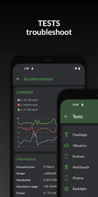 Tests: flashlight, vibrator, buttons, multitouch, display, backlight, charging, speakers, headset, earpiece, microphone and biometric scanners (the last six tests require PRO version)