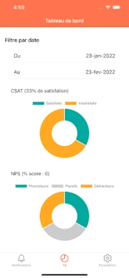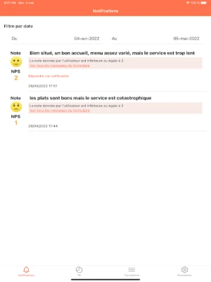 L'application permet aux managers feedback.ma de gérer les retours clients: commentaires, évaluations, notifications instantanées suivant leurs critères.