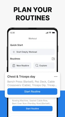 • Track your routines like 3 day workout split, full body split, bodybuilding routines, 5x5, upper lower, and push pull legs.