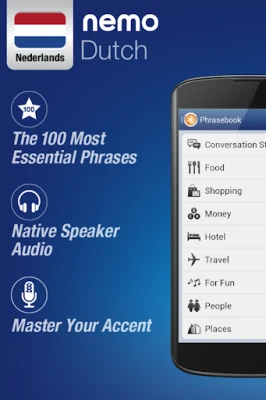 Nemo is designed to start you speaking the most useful words in Dutch immediately and confidently. With millions of downloads from around the world, Nemo is now available for Android phones and tablets.