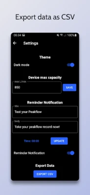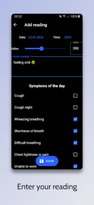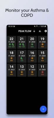 Features: - Track Peak Flow Meter values (your peak expiratory flow PEF) - Track Symptoms - Take notes - Export data as CSV - Get daily reminder notification - Get average morning and evening values - Data stored locally only - Chart for quick overview - Colors calculated from you personal best PEF - Dark and light mode